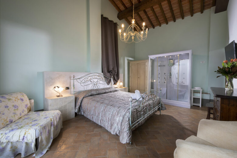 Double room with a beamed ceiling and a magnificent view of the Abbey of Monteoliveto. Includes an en-suite bathroom, a jacuzzi shower in the bedroom, …