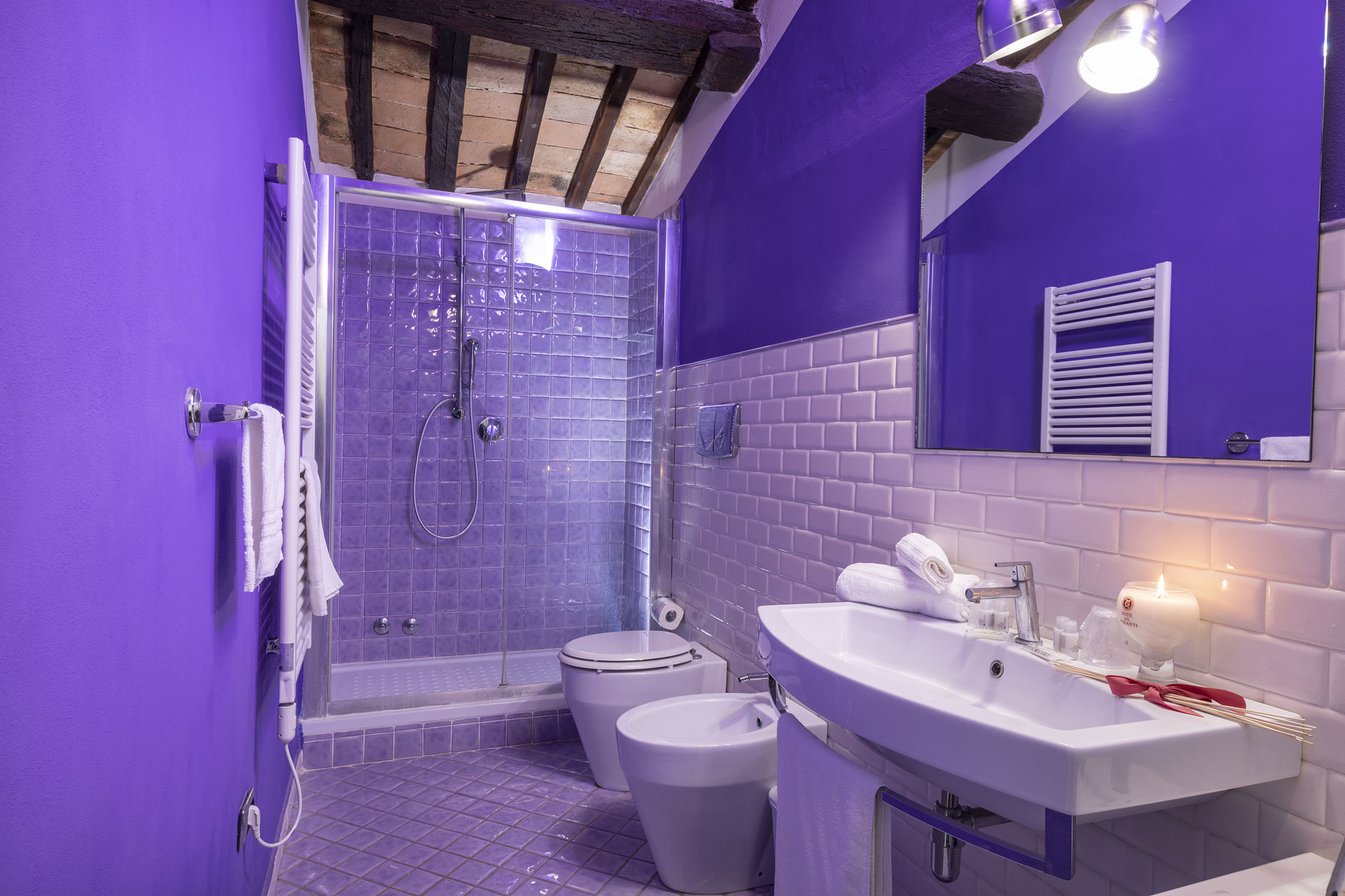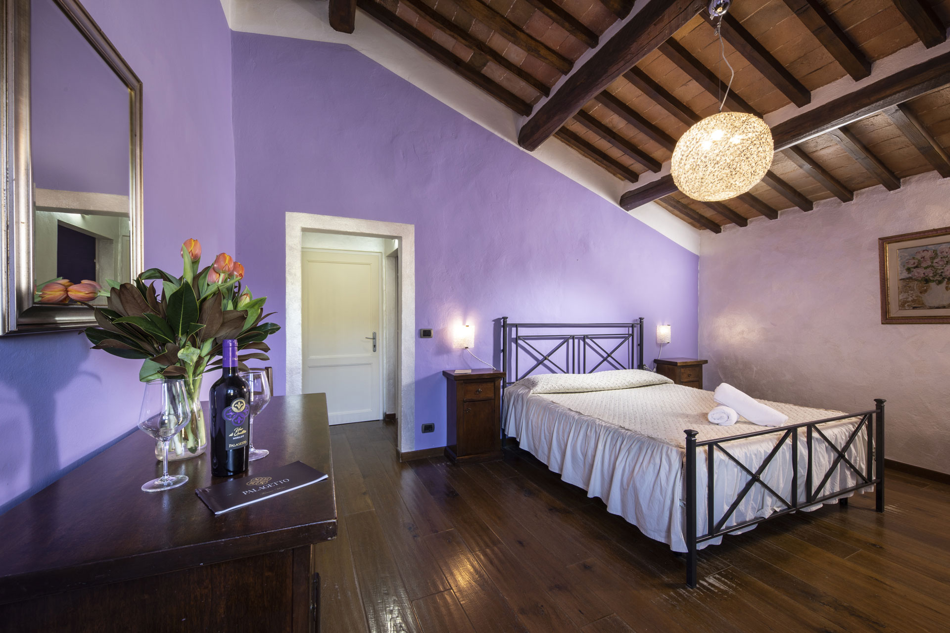 Located on the first floor, the Sangiovese Room is a charming and romantic double room in San Gimignano, offering guests an authentic Tuscan atmosphere and modern comfort. With its beamed ceilings, wooden flooring, and en-suite bathroom with shower, the room combines rustic elegance with understated luxury.
