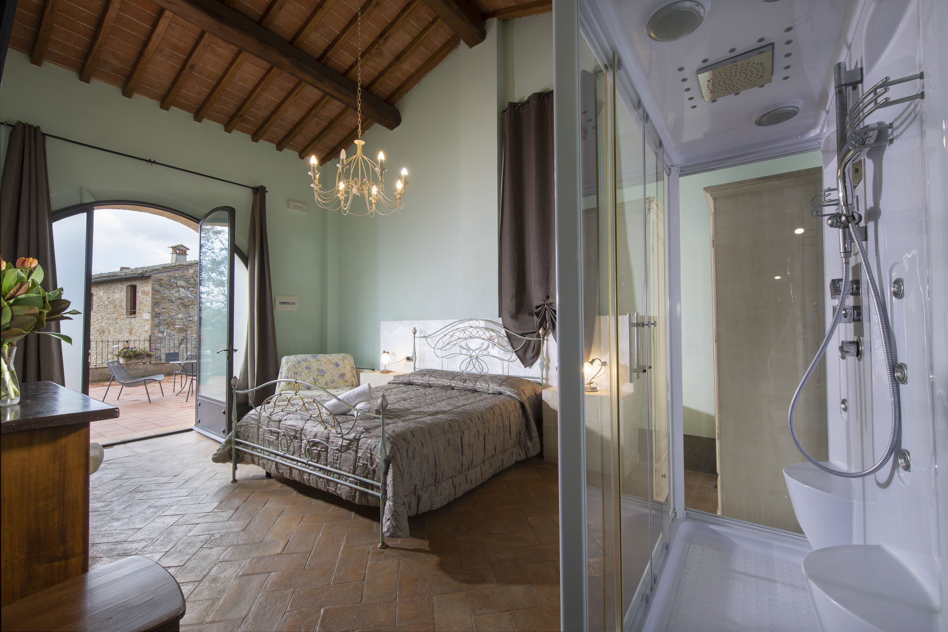 Double room with windows reminiscent of its erstwhile use and wooden flooring. En-suite bathroom with shower, suitable for people with disabilities. Satellite TV, air conditioning and heating included. The room is reached through a private terrace.